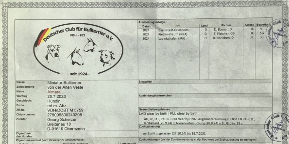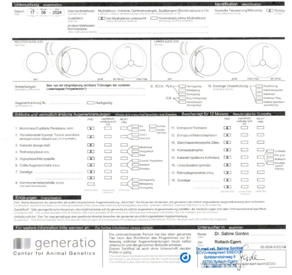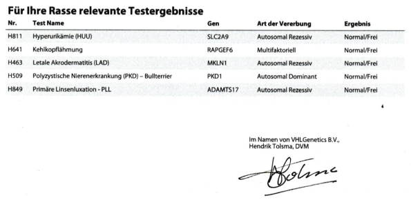 Die Herzdoppleruntersuchung und Nieren-Ultraschall/PKD waren ohne Befund es wurden keine Auffälligkeiten festgestellt.